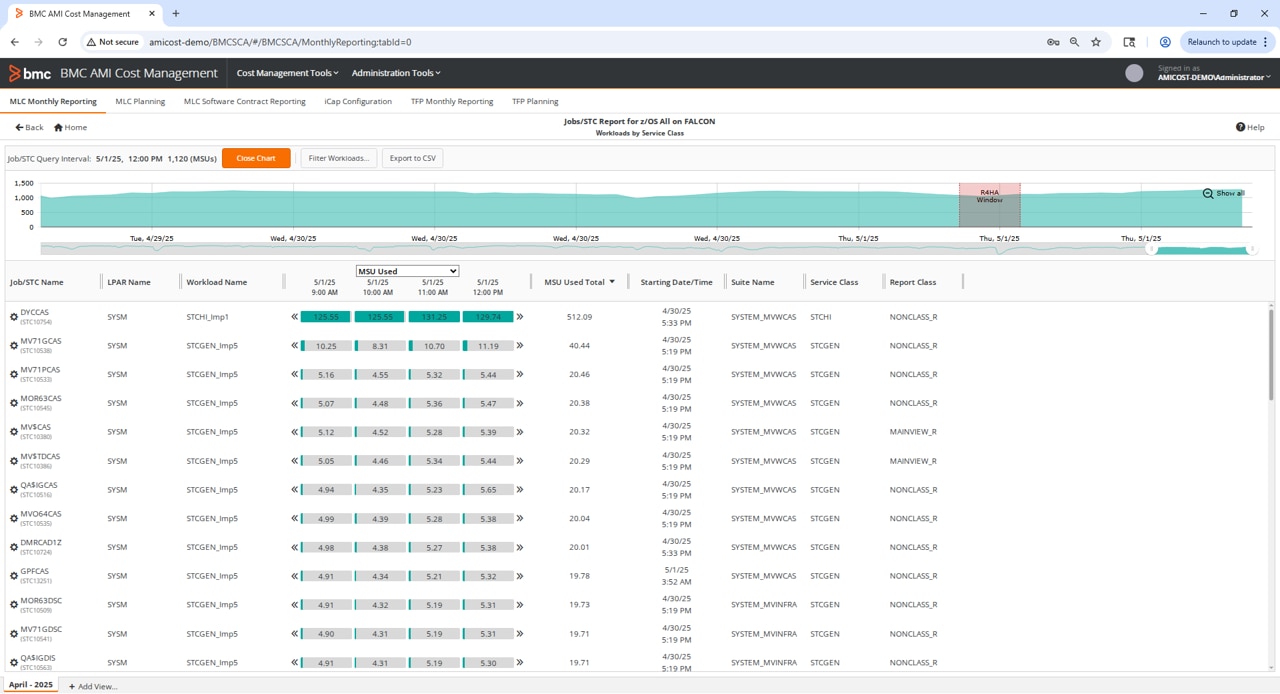 La interfaz de última generación muestra métricas de coste y utilización de manera completa pero concisa, incluyendo los principales factores del uso pico de recursos que contribuyen a los costes de licencias de mainframe (MLC)